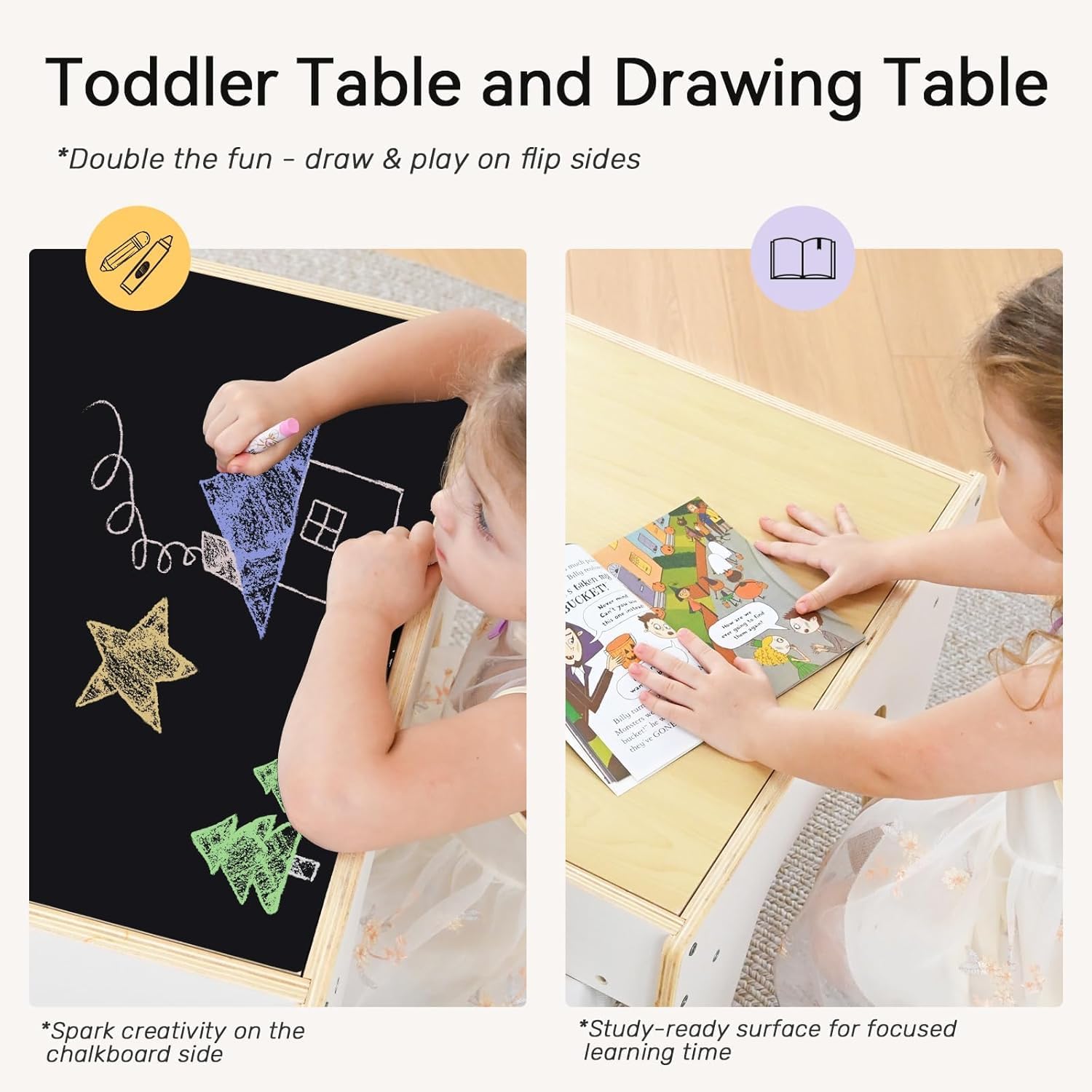 ✏️ Chalkboard & Flat Tabletop: Flip the tabletop for a chalkboard surface on one side and a smooth study or snack surface on the other.