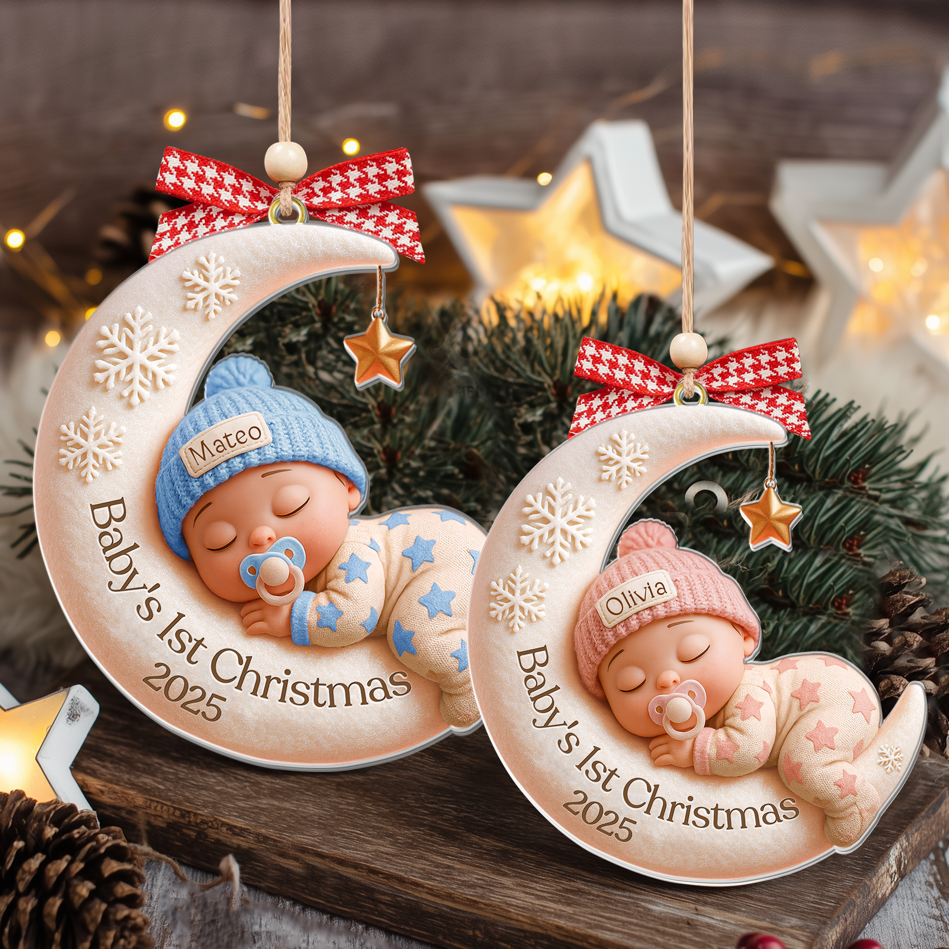 Create a magical memory for your little one’s first Christmas! This 3D acrylic ornament features a sweet baby sleeping on a crescent moon with stunning details and reflective effects. A timeless keepsake you can personalize with your baby’s name and the year, making the holiday season truly unforgettable.