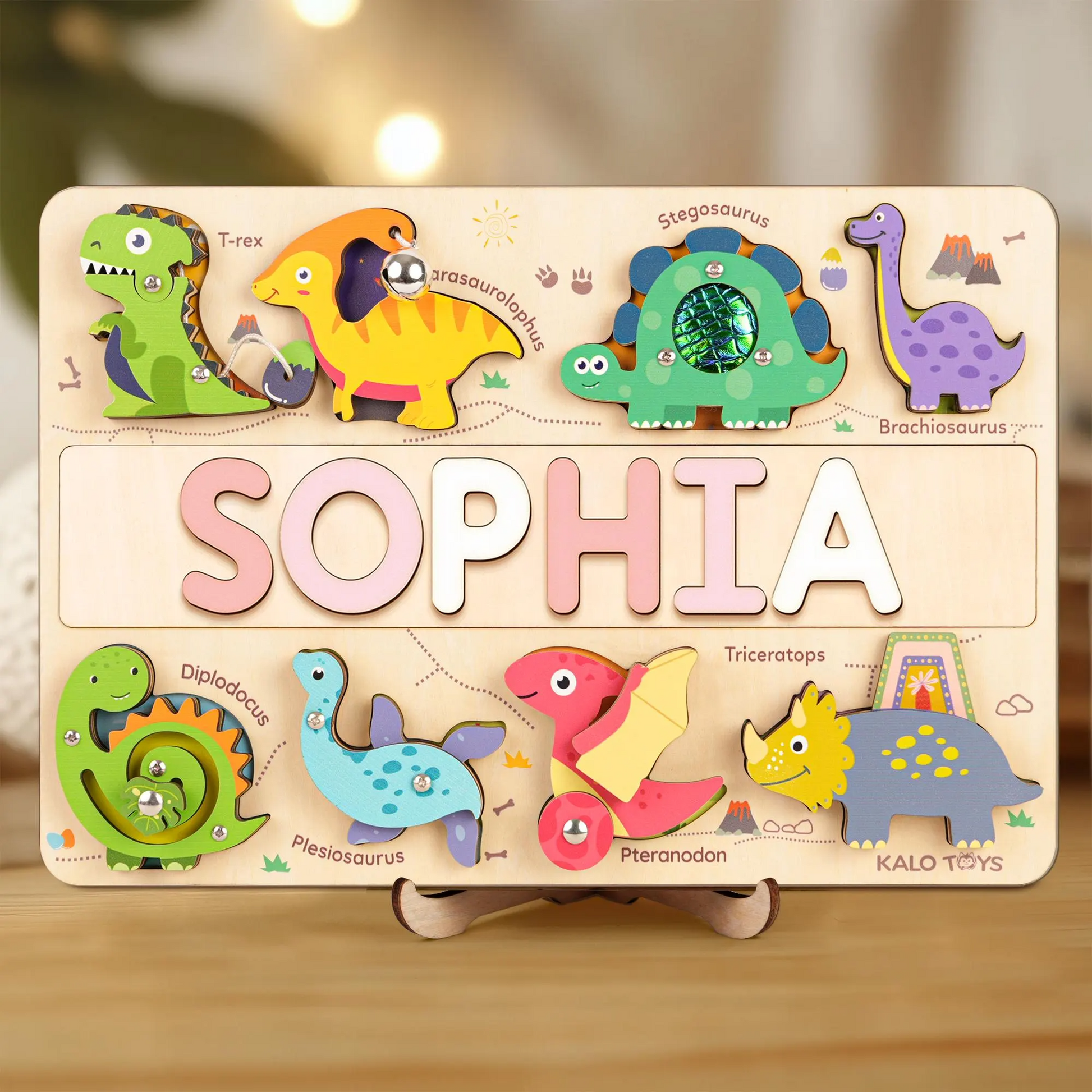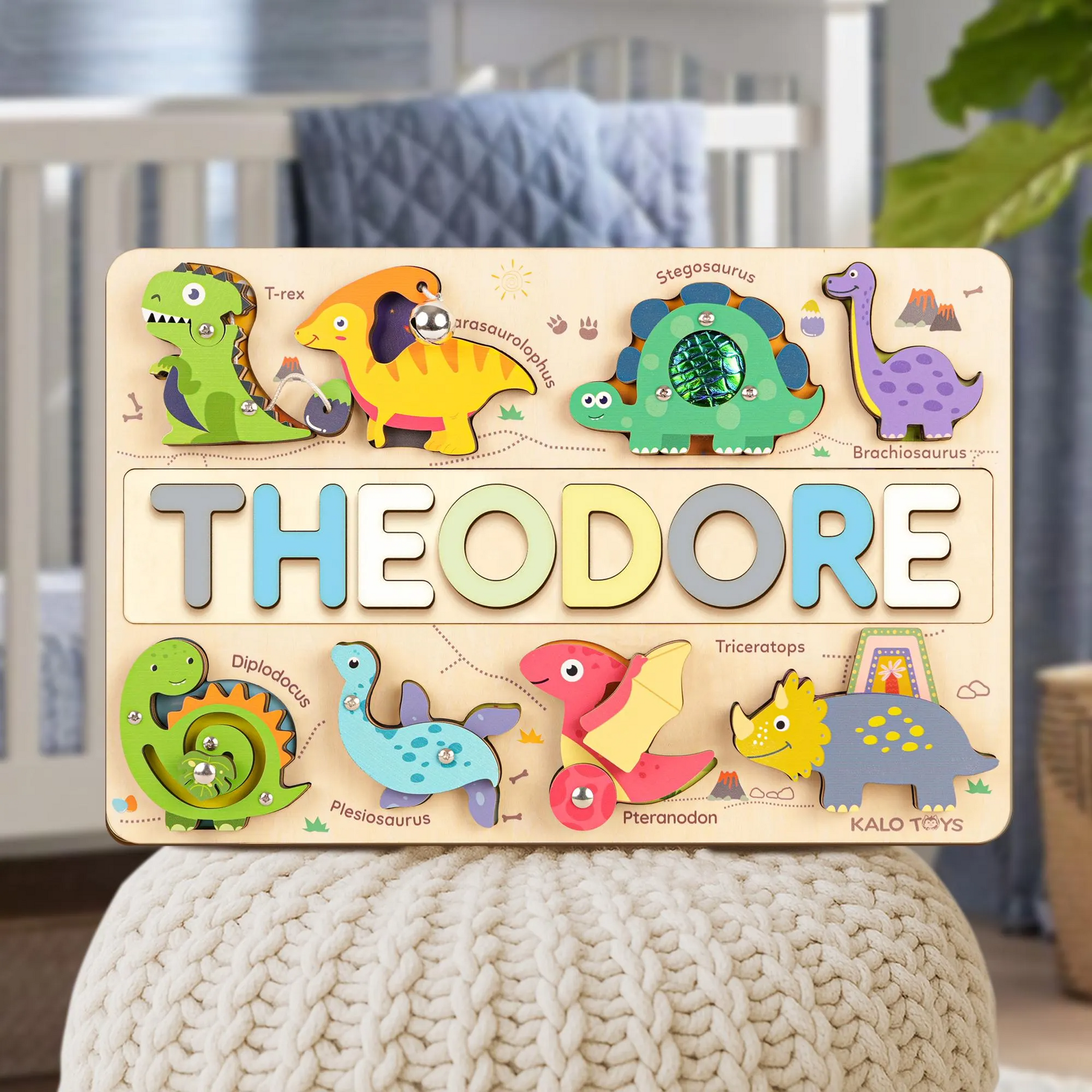 Introduce your little one to a world of personalized, hands-on learning with our Personalized Dinosaur Wooden Name Puzzle! Thoughtfully designed for toddlers aged 1-3, this Montessori-inspired puzzle turns your child’s name into a vibrant, interactive learning experience full of dinosaurs, colors, textures, and movement.