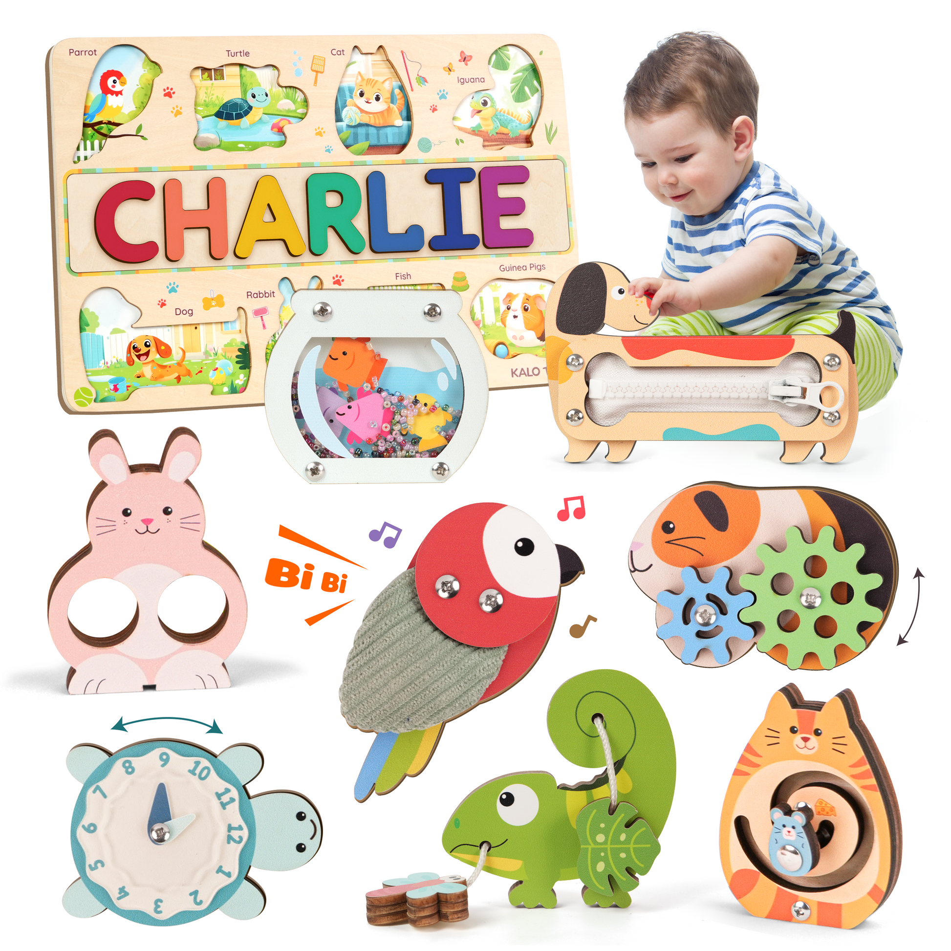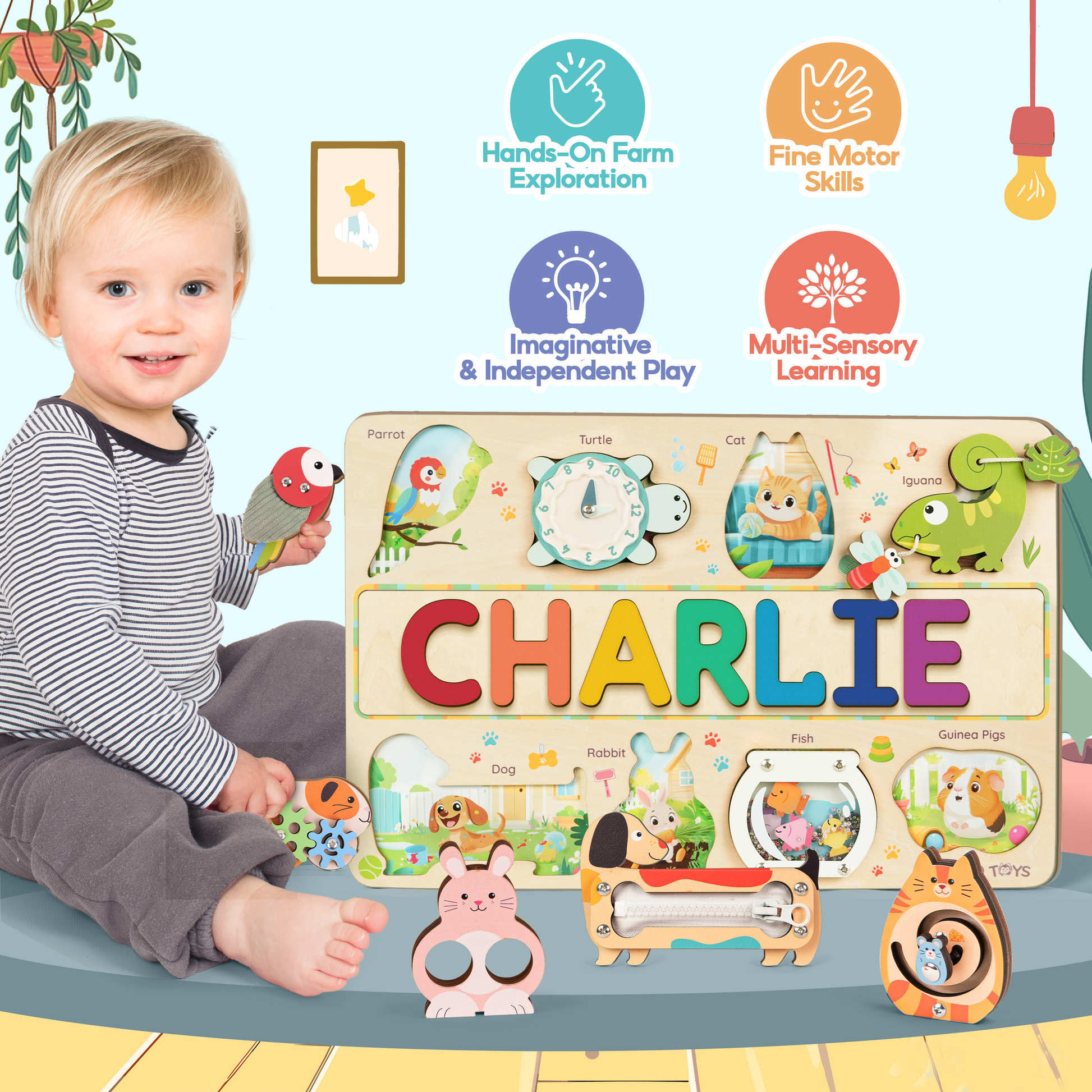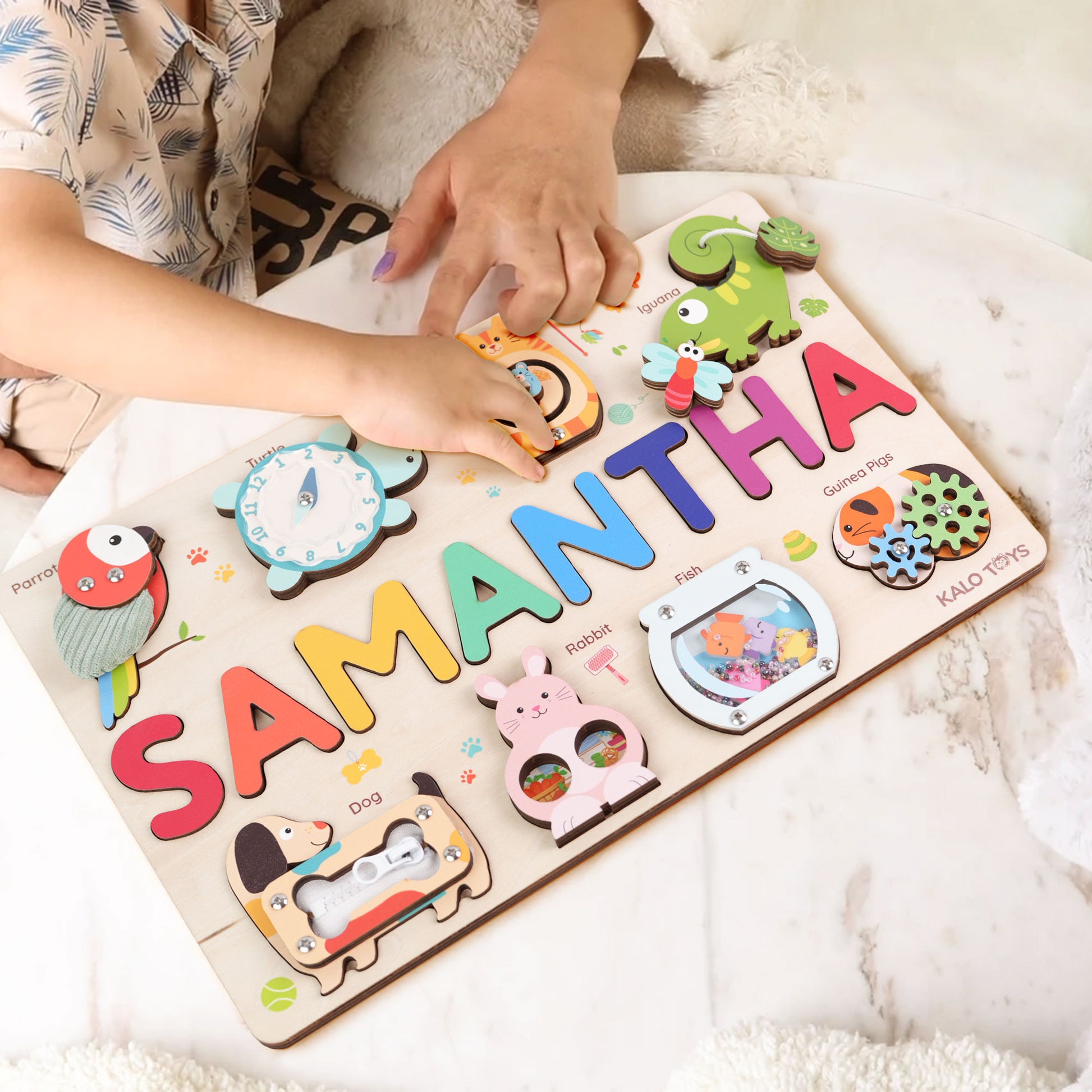 This adorable customizable pet puzzle board combines your child’s own name with a colorful world of interactive animals. Each piece offers a unique sensory experience — from zippers and gears to sounds and textures — designed to spark creativity, independence, and early learning through play.