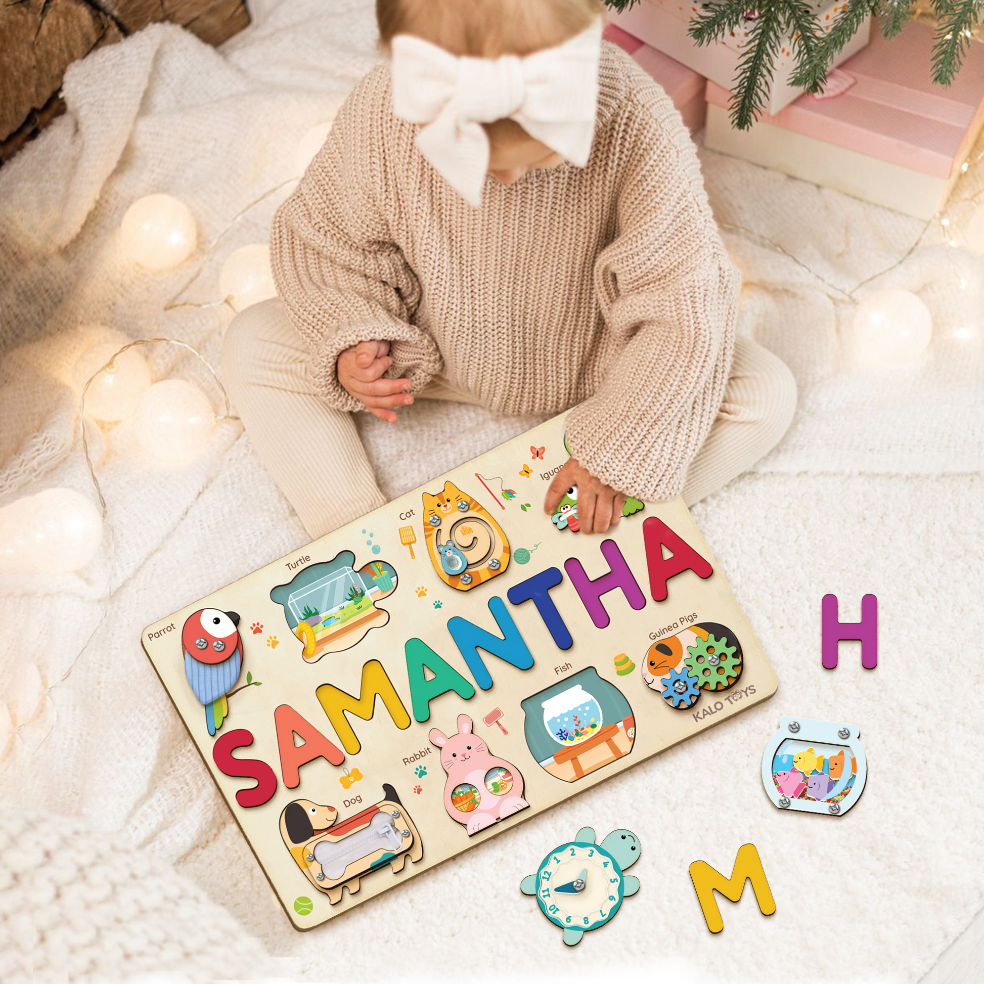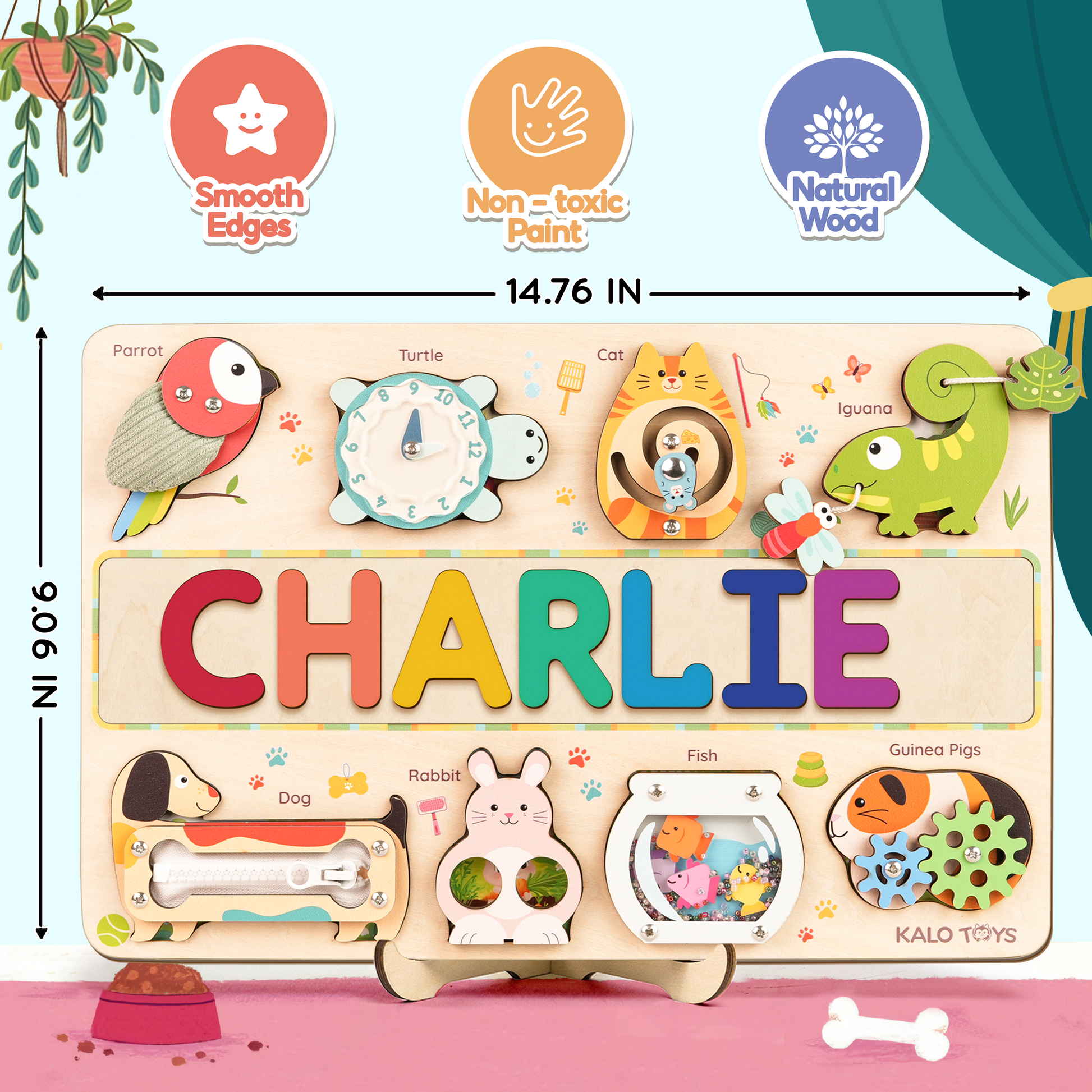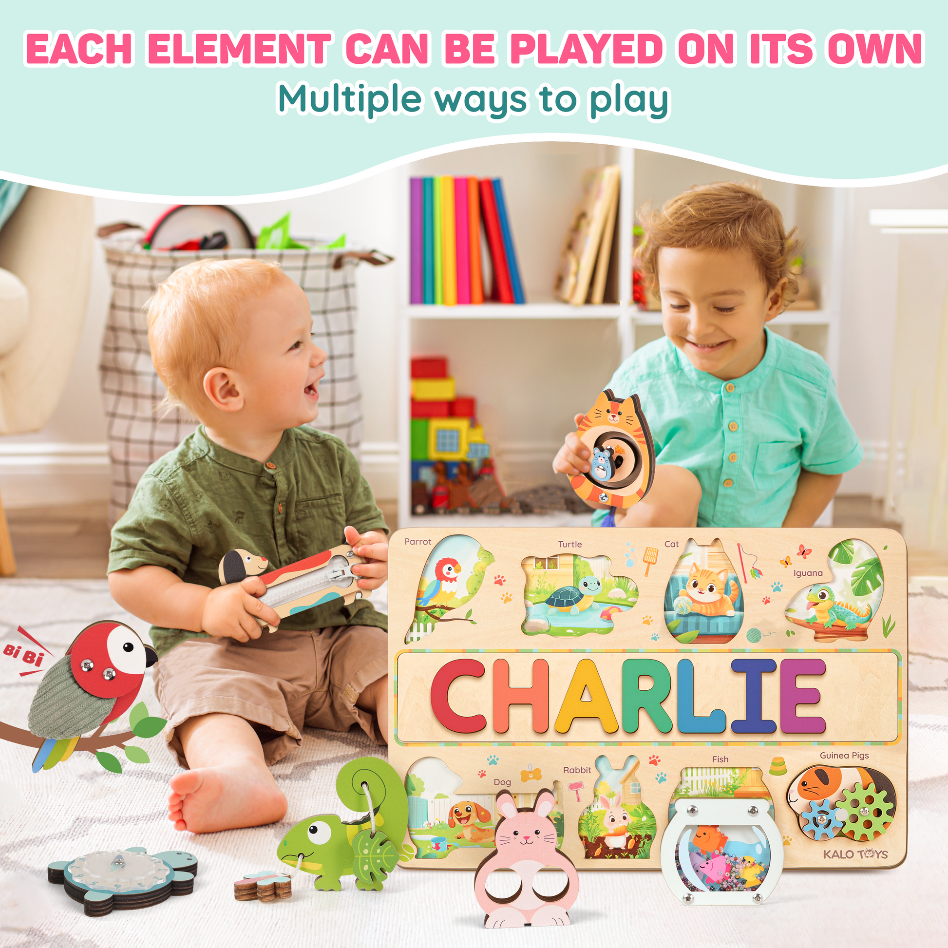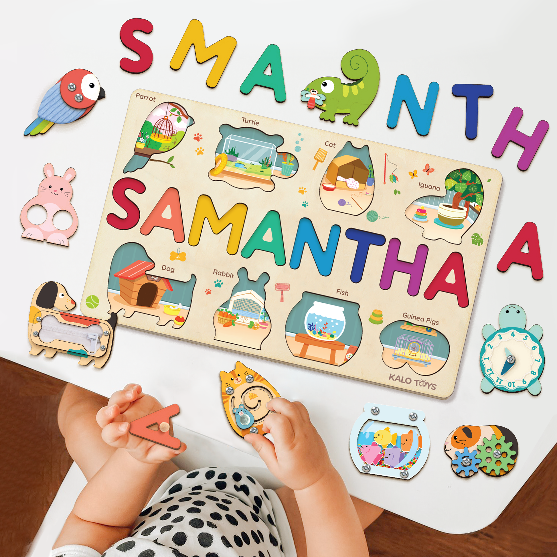 This adorable customizable pet puzzle board combines your child’s own name with a colorful world of interactive animals. Each piece offers a unique sensory experience — from zippers and gears to sounds and textures — designed to spark creativity, independence, and early learning through play.