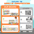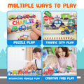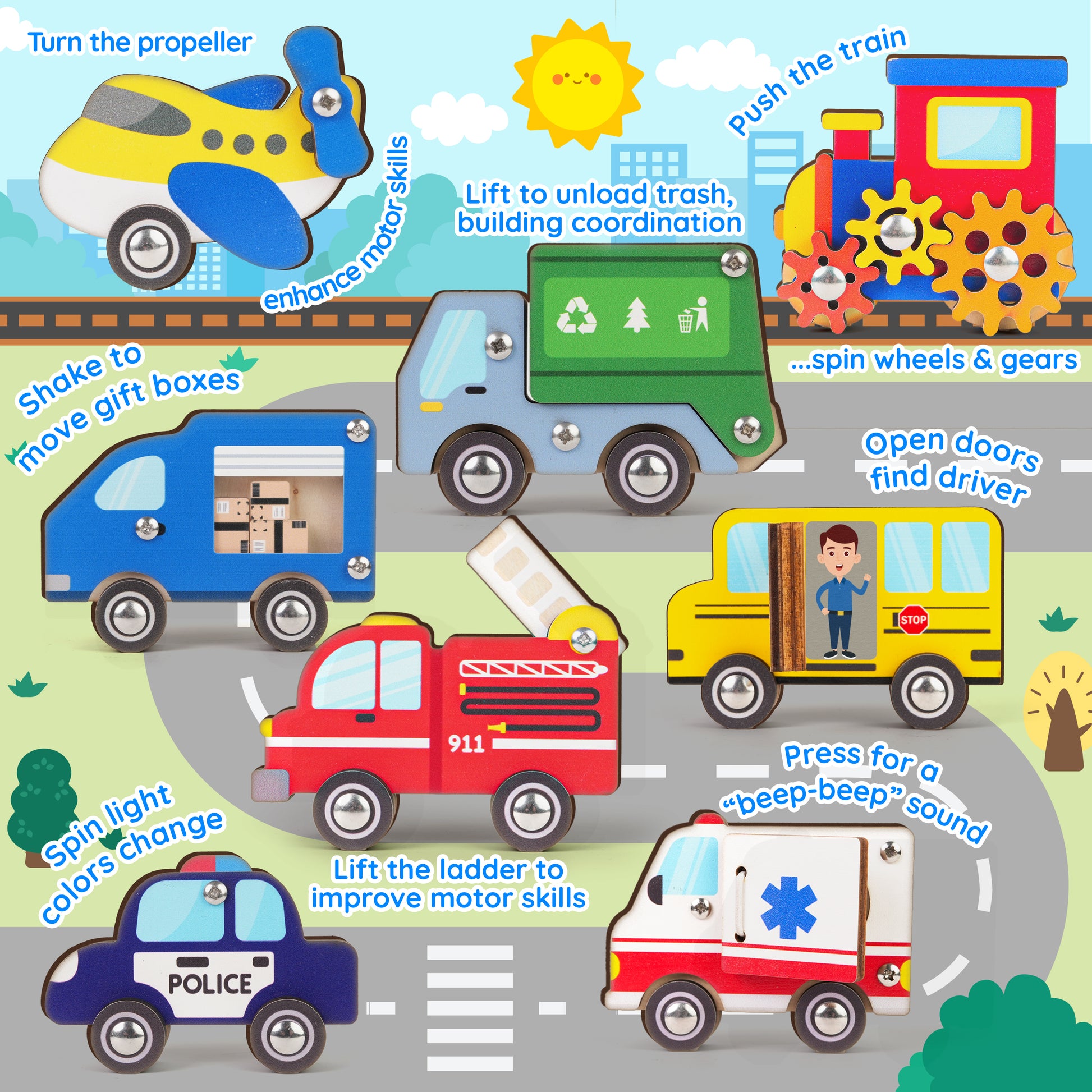 Each puzzle piece features a colorful vehicle—from fire trucks and school buses to delivery vans and airplanes—with built-in activities that encourage curiosity and fine motor development. Kids can spin gears, push trains, turn propellers, shake boxes, lift ladders, and even press for sound effects!