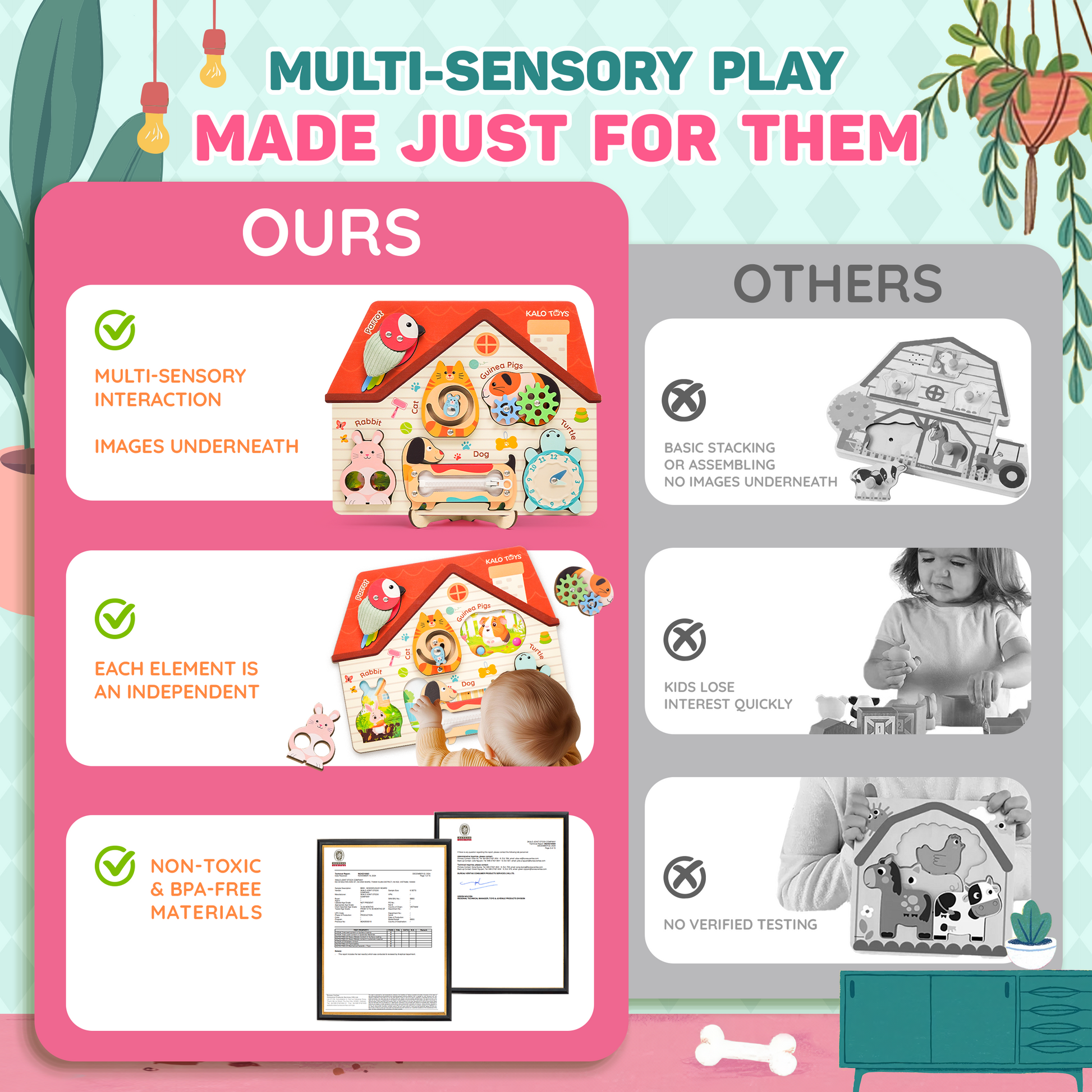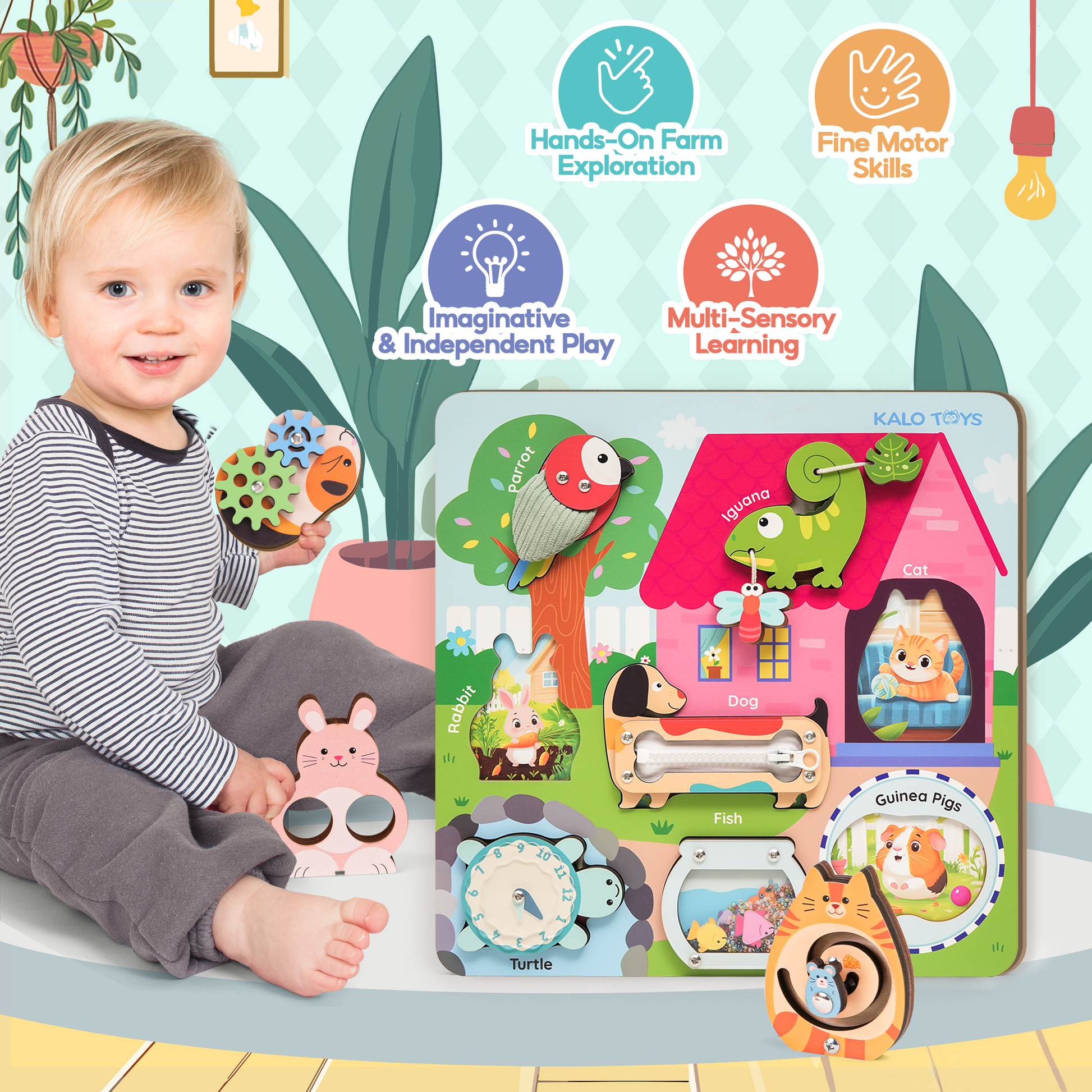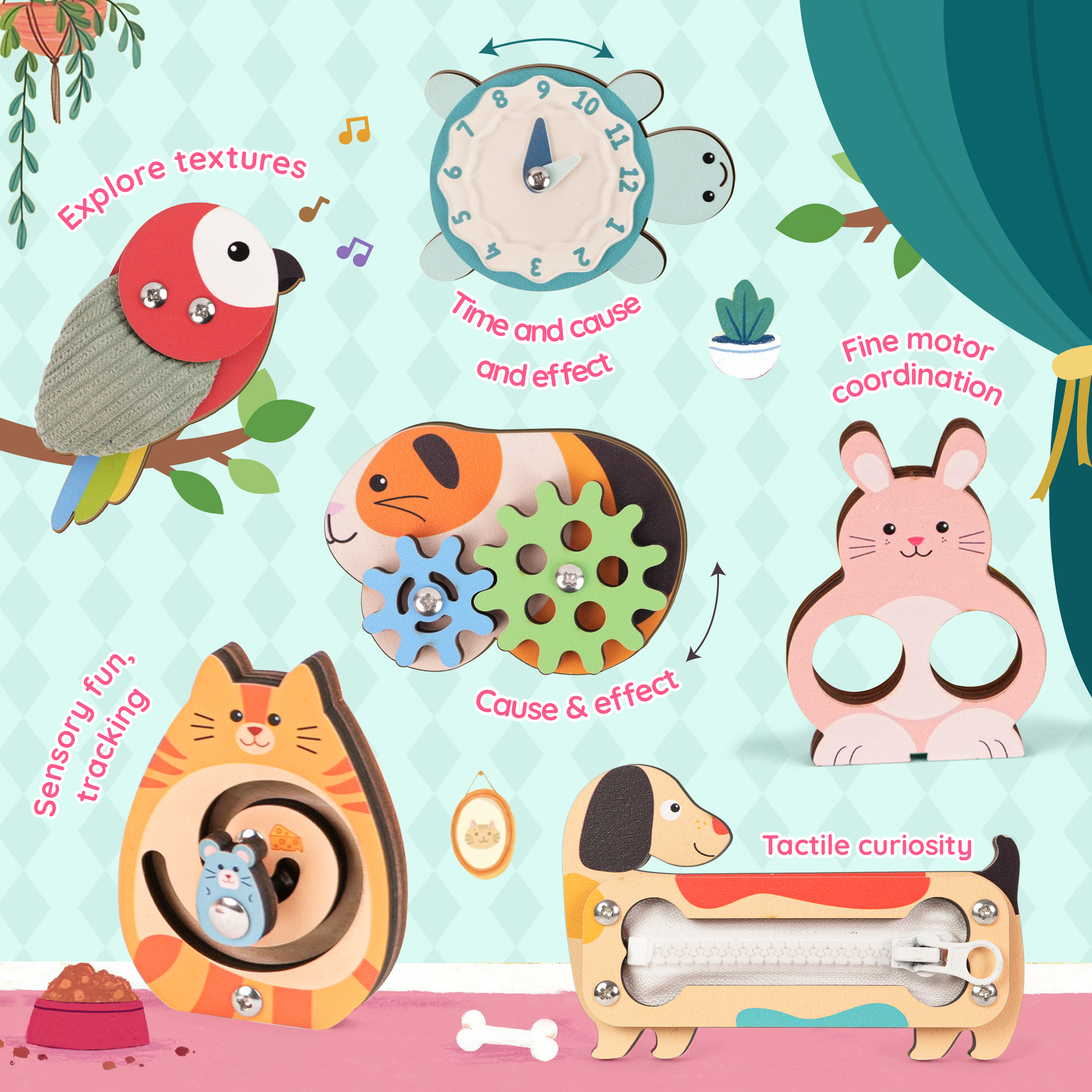 Each pet offers a unique activity to engage touch, sight, and coordination while strengthening early problem-solving skills. -