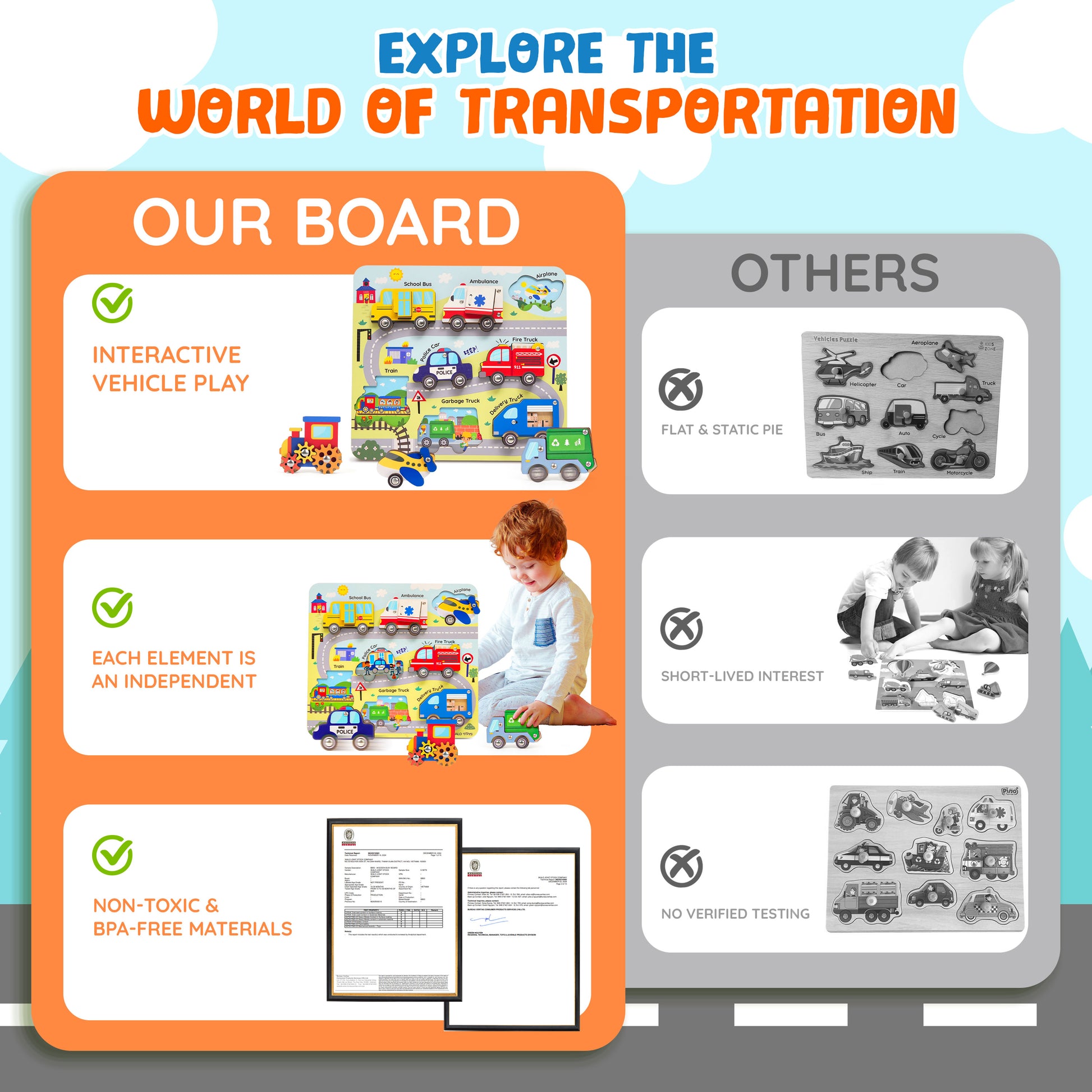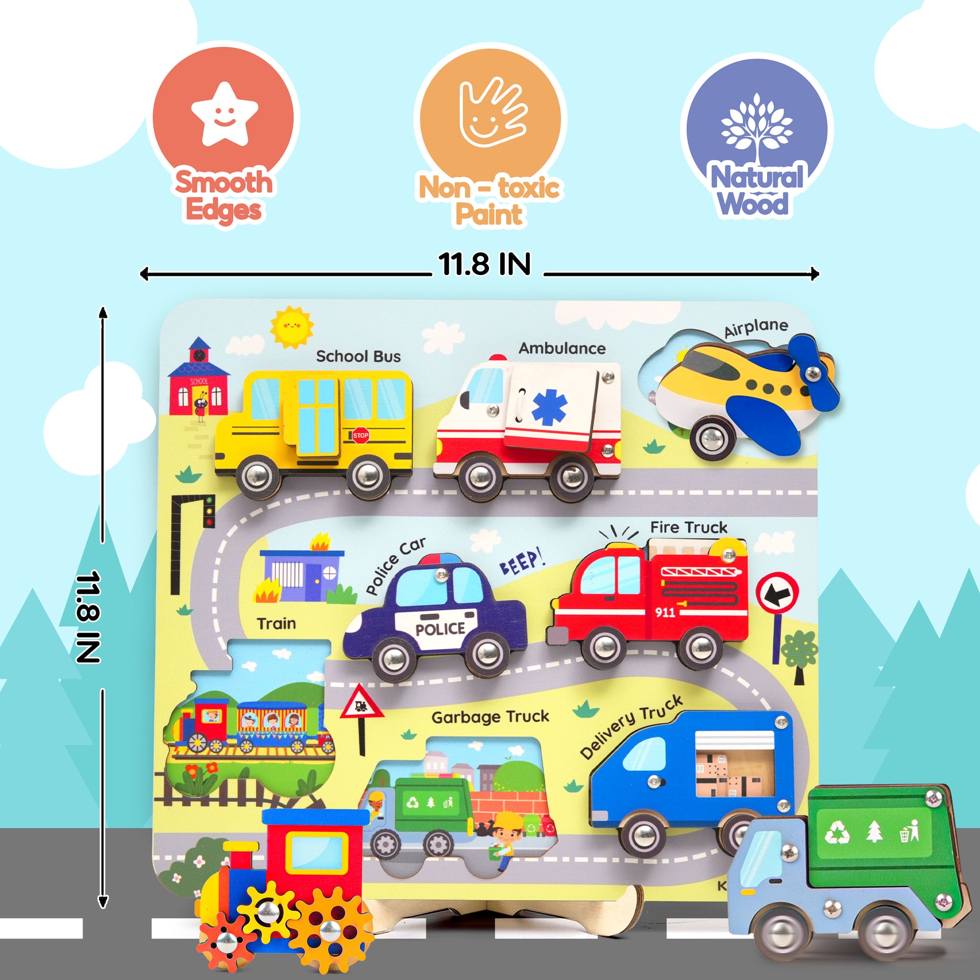 Let your little driver explore a world of motion, color, and discovery with this interactive wooden vehicle puzzle. Each car, plane, and train comes to life with moving parts, sounds, and textures — helping toddlers learn through hands-on play the Montessori way.
